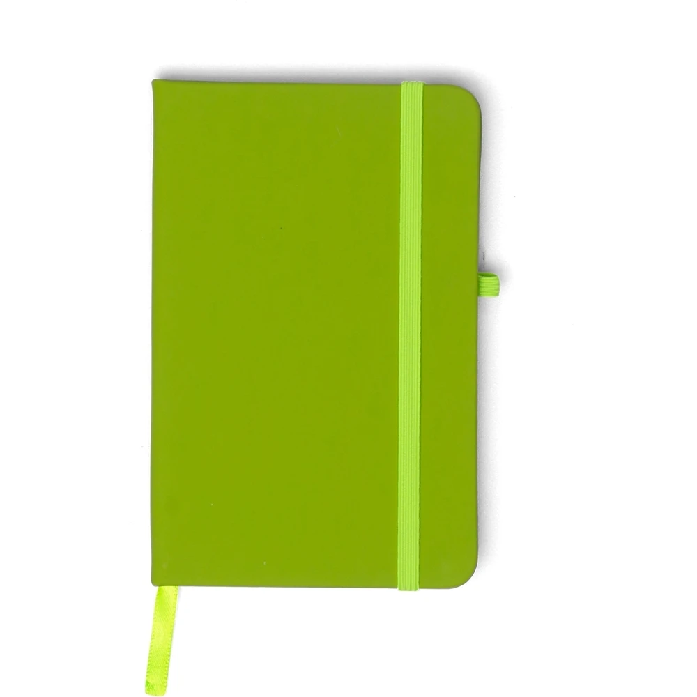 Caderneta Tipo Moleskine Personalizado emborrachada com porta caneta elástico em nylon, marcador de página em cetim e fita elástica de nylon para fechar. Contém aproximadamente 80 folhas pardas pautadas.
